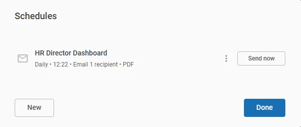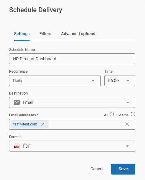 An HR Admin can send a dashboard to any user, even if they do not have direct access to it, by simply entering their email address. Once the delivery is saved, the recipient will receive an email with the dashboard attached in the chosen format.