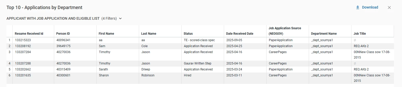 On the HR Director dashboard, the Top 10 - Applications by Department tile offers drill-down functionality. Clicking on a specific department's bar in the chart will open a new window, displaying a detailed table view of the applications for that department.