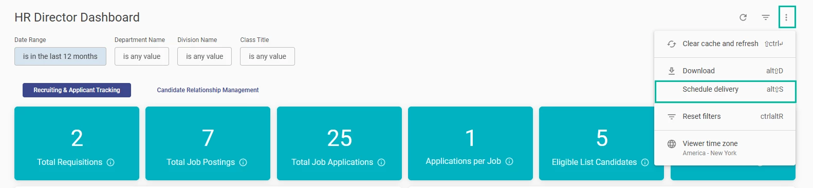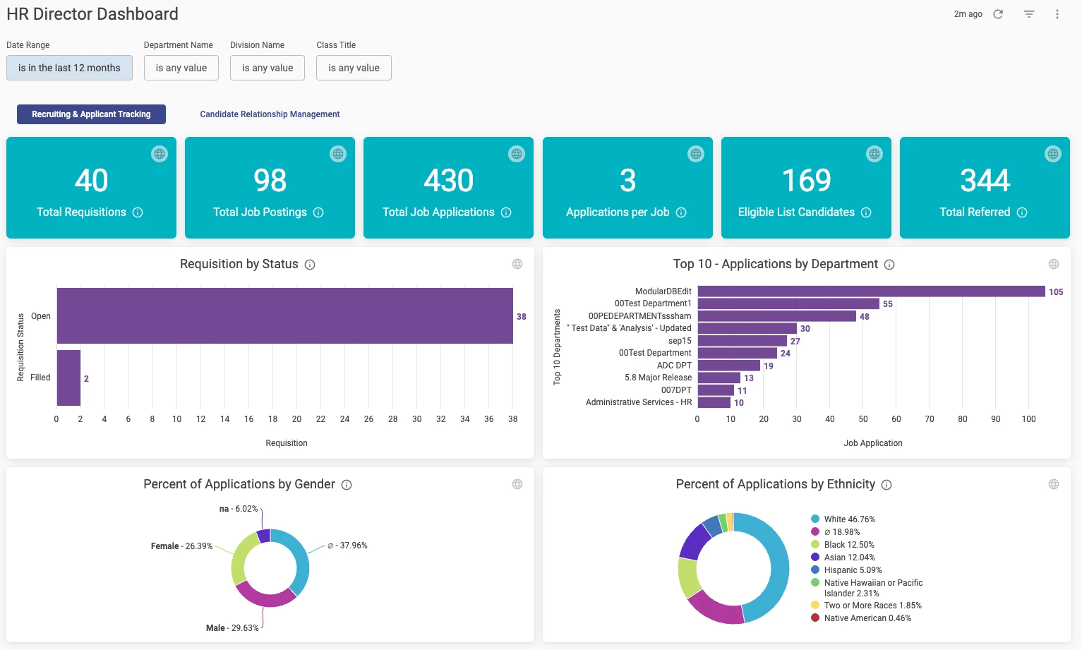- HR Director Dashboard – designed for high‑level workforce insights, requisition monitoring, and applicant demographics.
