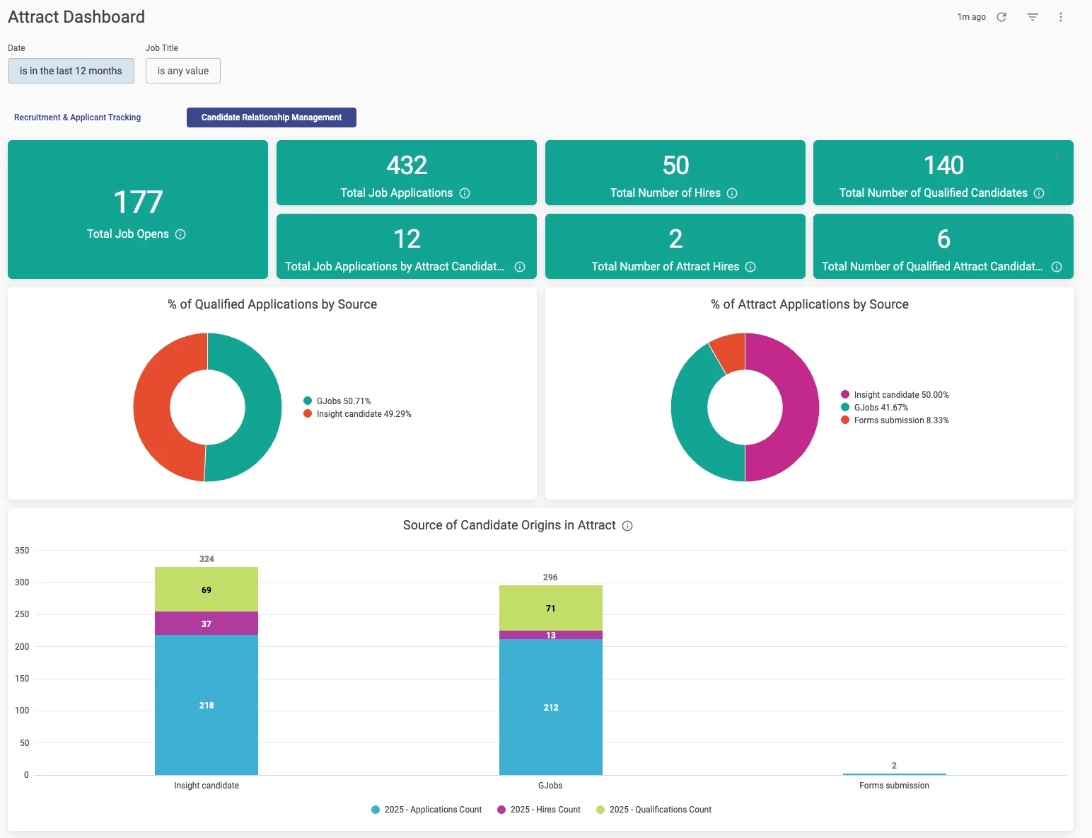 - Attract Dashboard – focused on applicant sourcing, hiring funnel analytics, and recruiting efficiency.