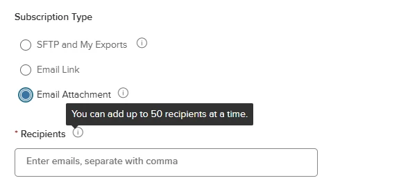 With this enhancement, users are now able to add up to 50 recipients for this subscription type. This limit applies only to new reports created after this release.