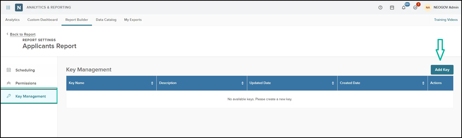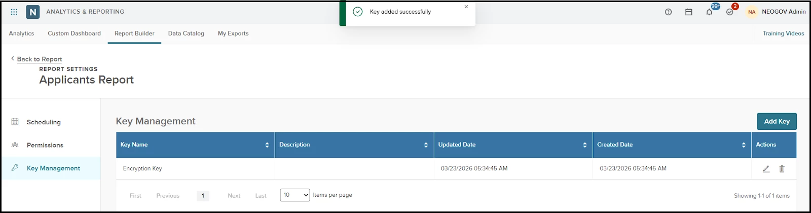 Report Builder > Settings > Key Management
