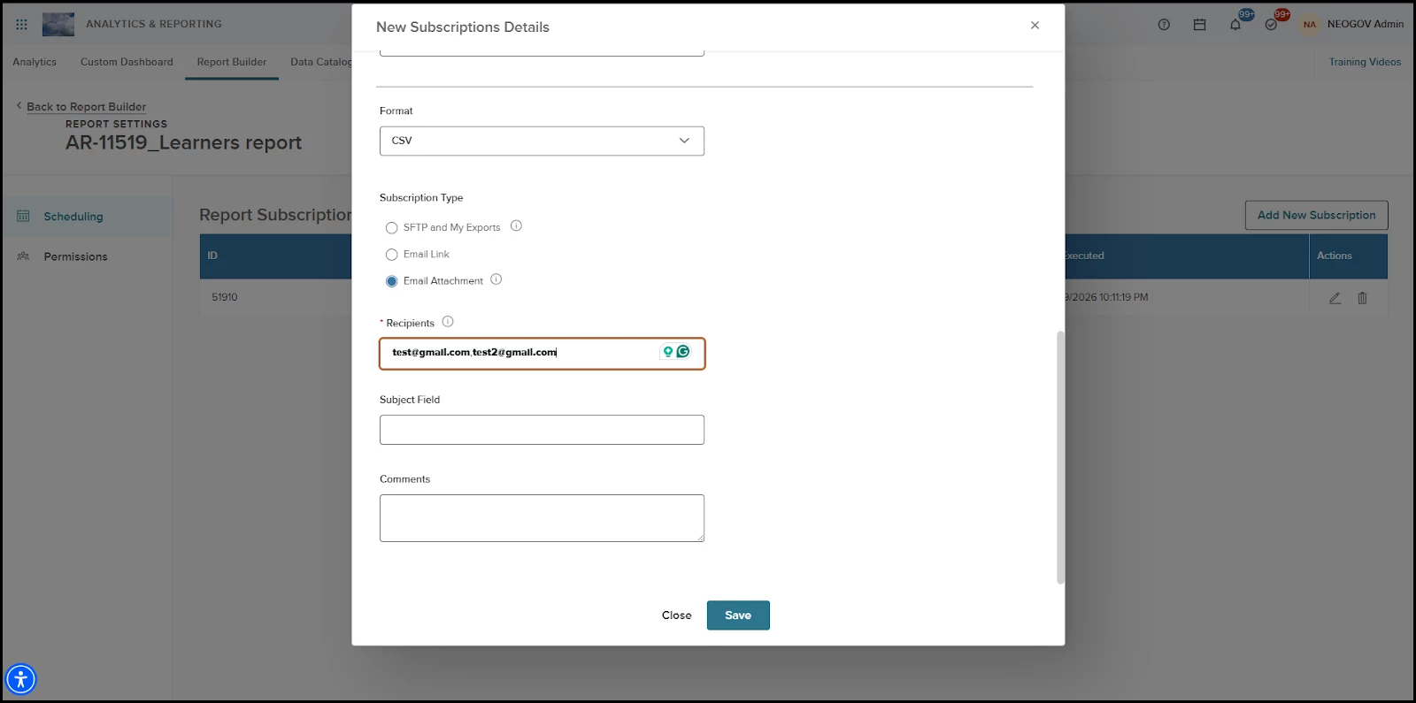 As part of this release, users can create subscriptions to Learn reports and have them delivered as email attachments to any valid email address. This includes shared inboxes and external recipients outside your system.