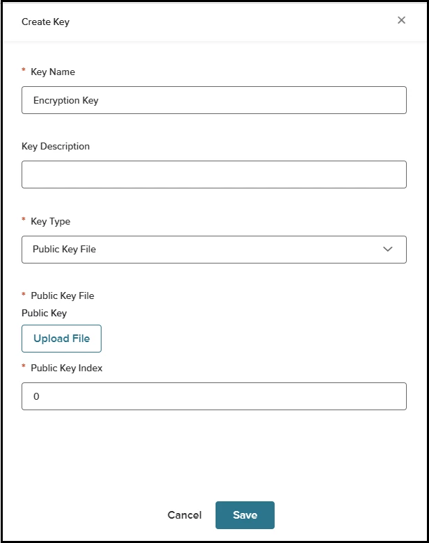 - The Public Key Index field is set to 0 by default. You can change this value if you use multiple public keys in one encryption key. If not, we advise using the default value.