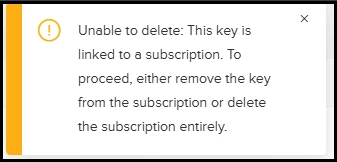 - A key cannot be deleted if it is currently in use by a subscription (see the below screenshot).
