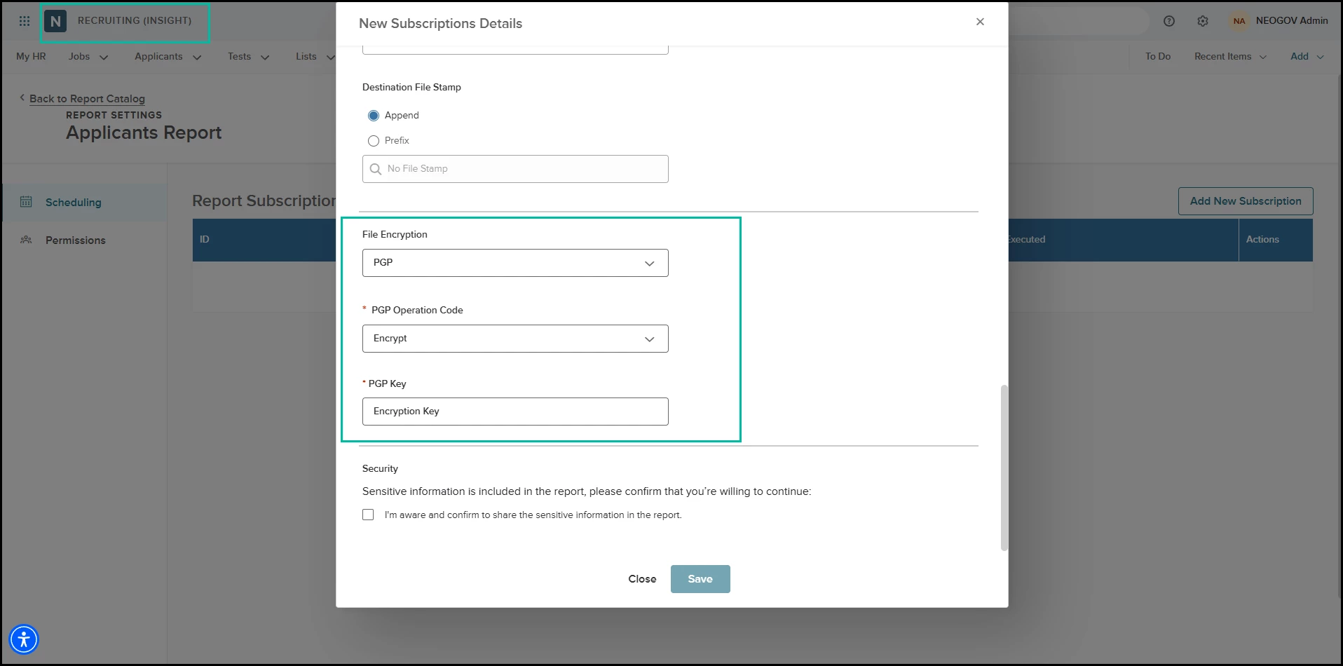 - Encryption is supported for recruitment reports subscriptions only.