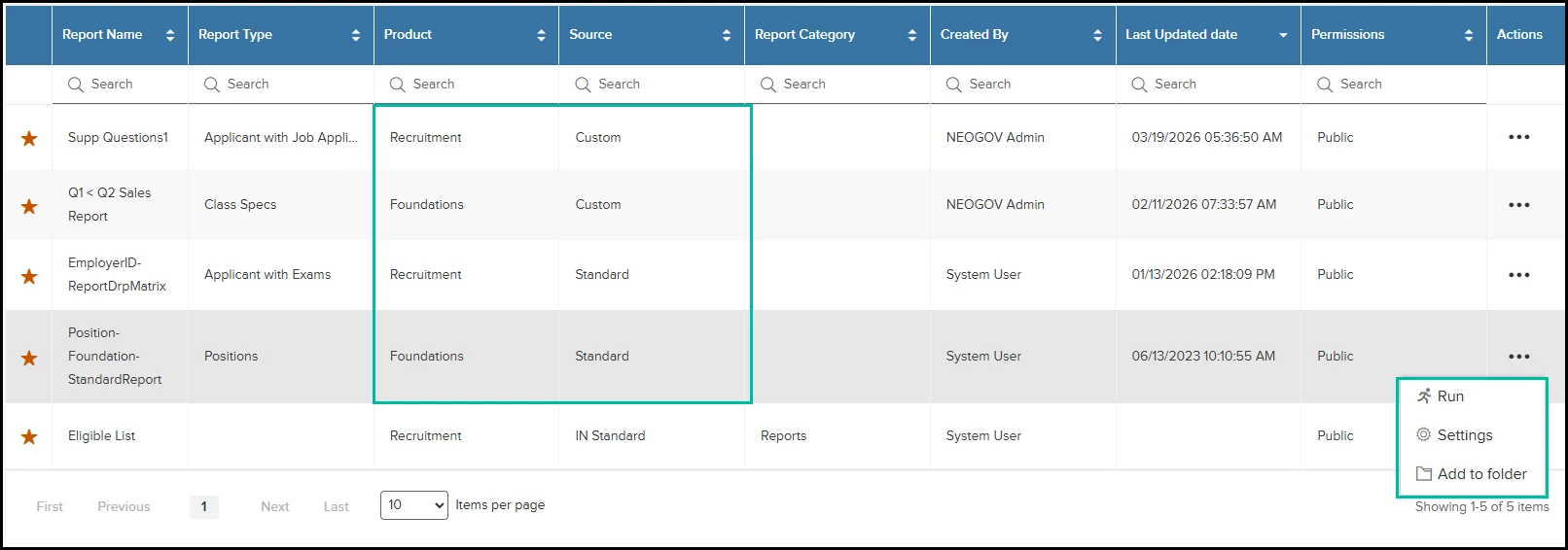 - Settings: Recruitment/Foundation Standard and Custom reports.