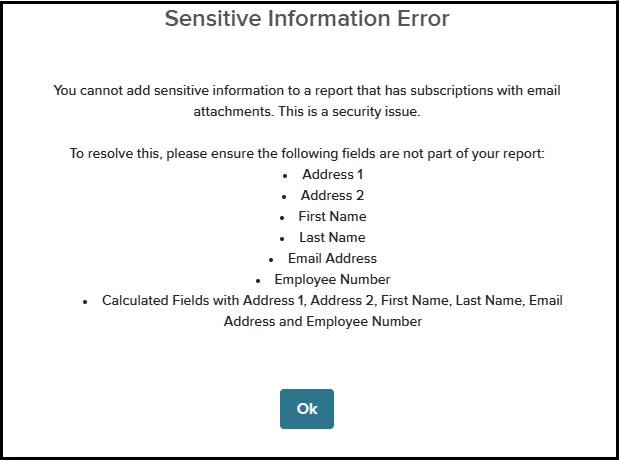 - If the report contains PII fields: Address 1, Address 2, First Name, Last Name, Email Address, or Employee Number, the Email Attachment option is disabled.