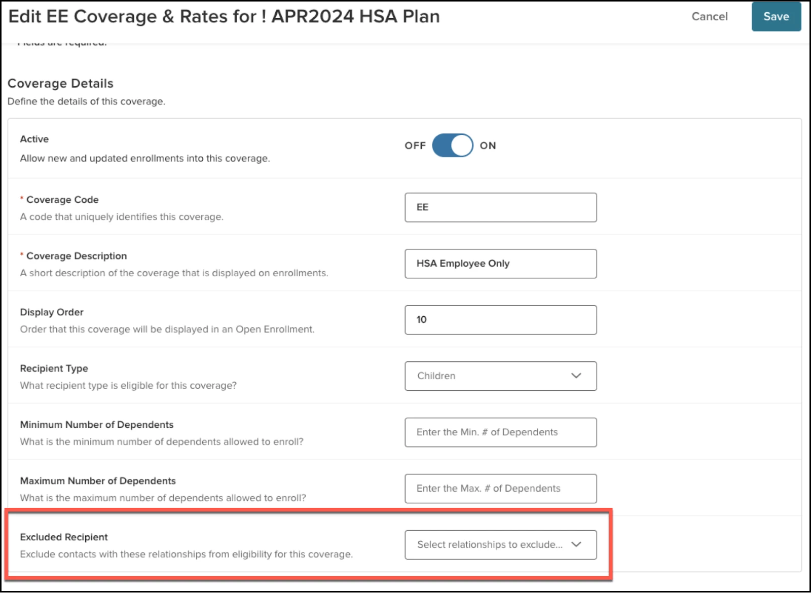 - When saving the setting, the system will do a check to determine if there are any active enrollments with dependents that have the excluded relationship, and if so the user will be prevented from saving the change.