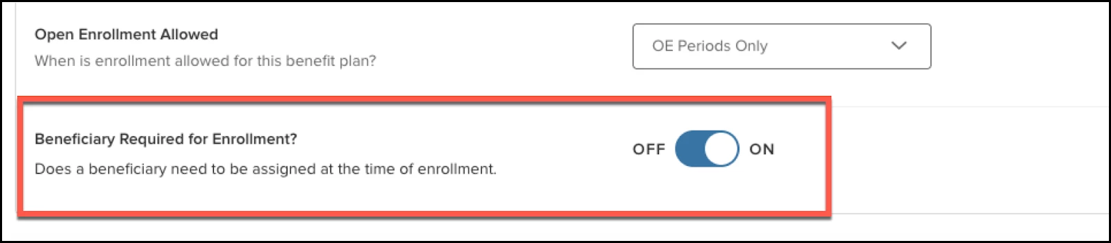 - When the setting is set to OFF, the beneficiary will not be required during enrollment.