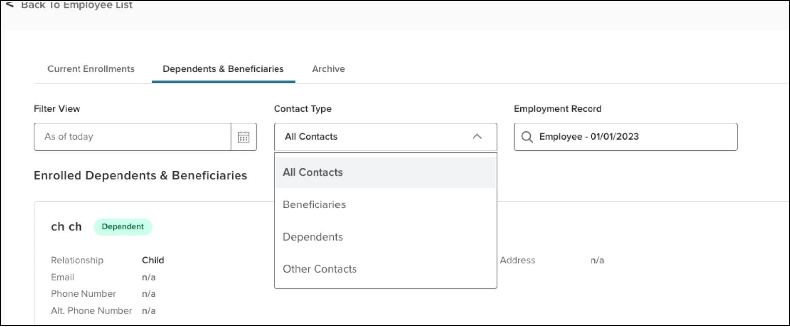 A new Contact Type filter has been added on the Dependents & Beneficiaries tab that allows users to quickly narrow the list to contacts of the following types: All Contacts (default), Beneficiaries, Dependents, Other Contacts.