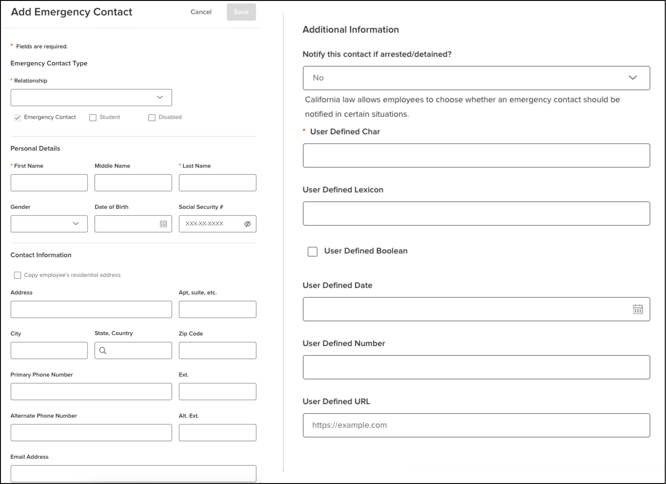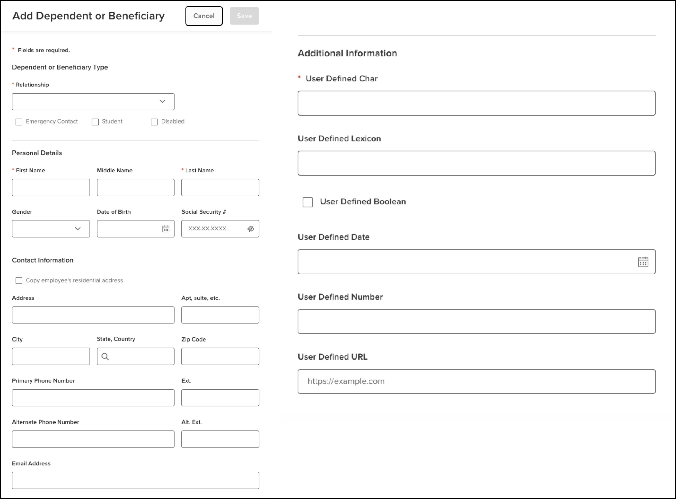 Previously there were two different screens that users used to manage a contact dependent on if they were dependents, beneficiaries or an emergency contact. It has now been consolidated into one experience, where the available fields and the logic on whether they are required or not will adjust based on the type of contact it is. The following are the differences in behavior between the new popups and the equivalent in the previous experience.