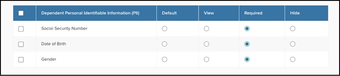 Admins can configure whether the following fields are required or not for a dependent: Social Security Number, Date of Birth, and Gender. For each of these fields they have one of the following options.
