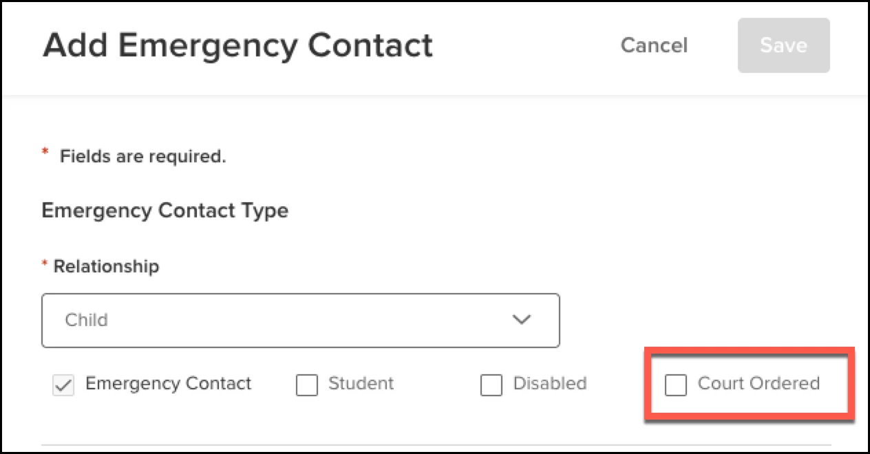 - You can specify if this is an Emergency Contact, Student, Disabled, or Court Ordered. The Emergency Contact will be selected and uneditable. Previously these options were not available when you just added a contact.