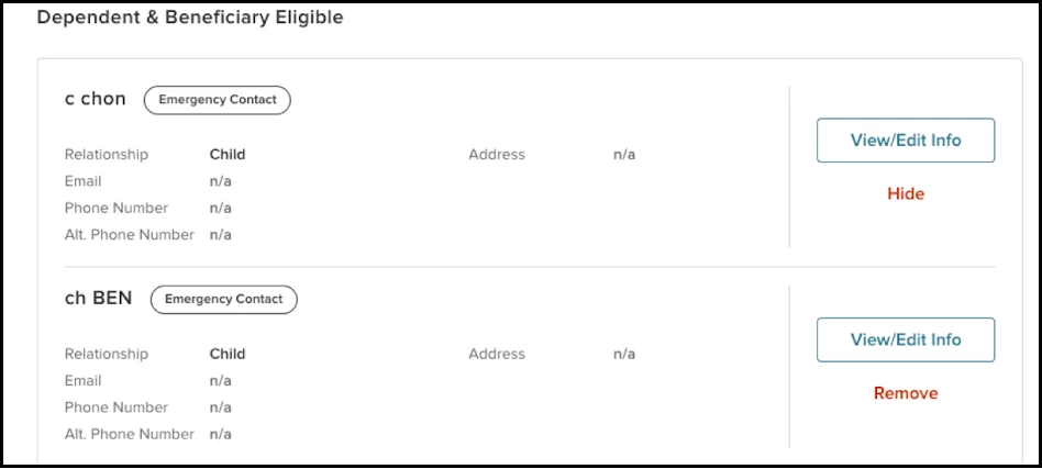 Users can now remove dependents that have never been previously enrolled in a plan. Previously they could only remove dependents that had never been previously enrolled. A new Hide option has been added to the Dependents & Beneficiaries tab to remove dependents that were previously enrolled in a plan. Hide marks the dependent as inactive, and makes them unavailable to be selected for enrollments.