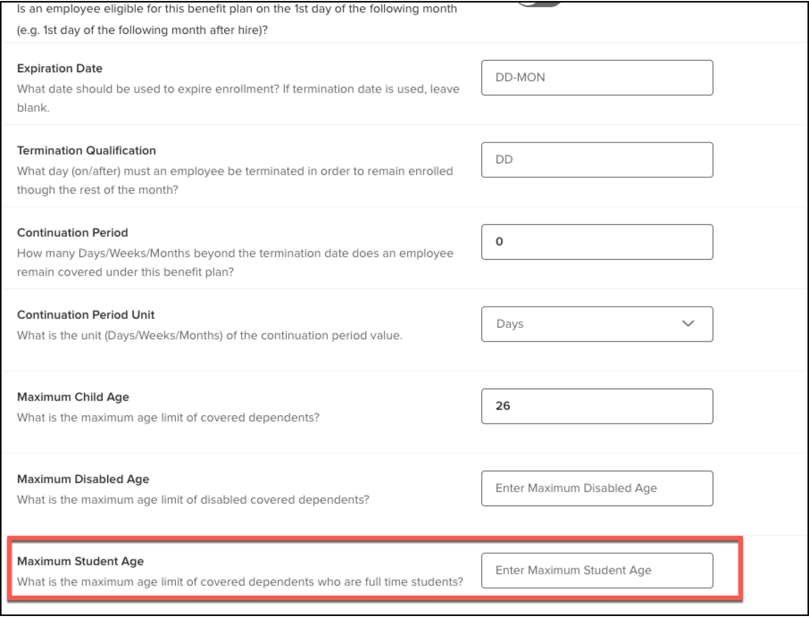 Employers will now be able to support having a different set of age rules for dependents who are flagged as students. They will be able to configure a maximum age at a coverage level to determine if a dependent who is identified as a student is eligible for a plan based on their age. This value will be used in all enrollment processes and the automated over age process.