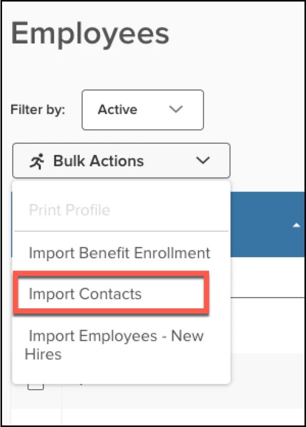 Employers are now able to upload contacts in bulk through a file. This feature will need to be enabled. Once it is enabled, it will appear in the Bulk Actions dropdown on the Employees page. The workflow is the same as all of our other imports. Additional information around the configuration, the file spec, the validation can be provided upon requesting either support or the implementation consultant team.