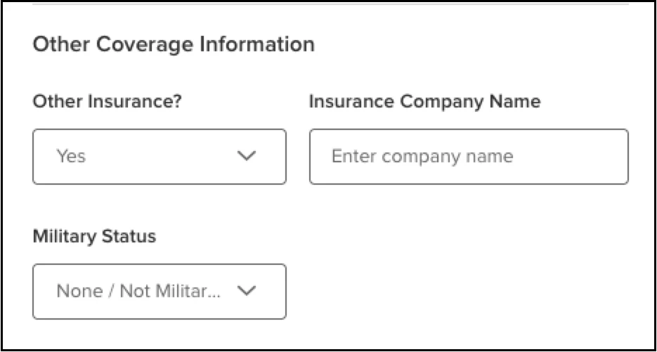 - Insurance Company Name: The name of the company. This field only shows if they answered Yes to the Other Insurance? question.