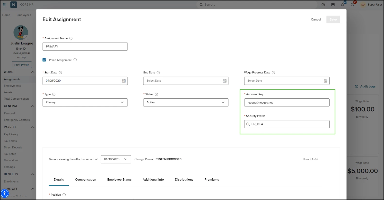 With this update, we've moved the Security Profile and Accessor Key fields from the USERS page under the Admin menu to the top section of the employee's assignment record. This change makes things easier when you have to perform multiple updates on an employee record at the same time.
