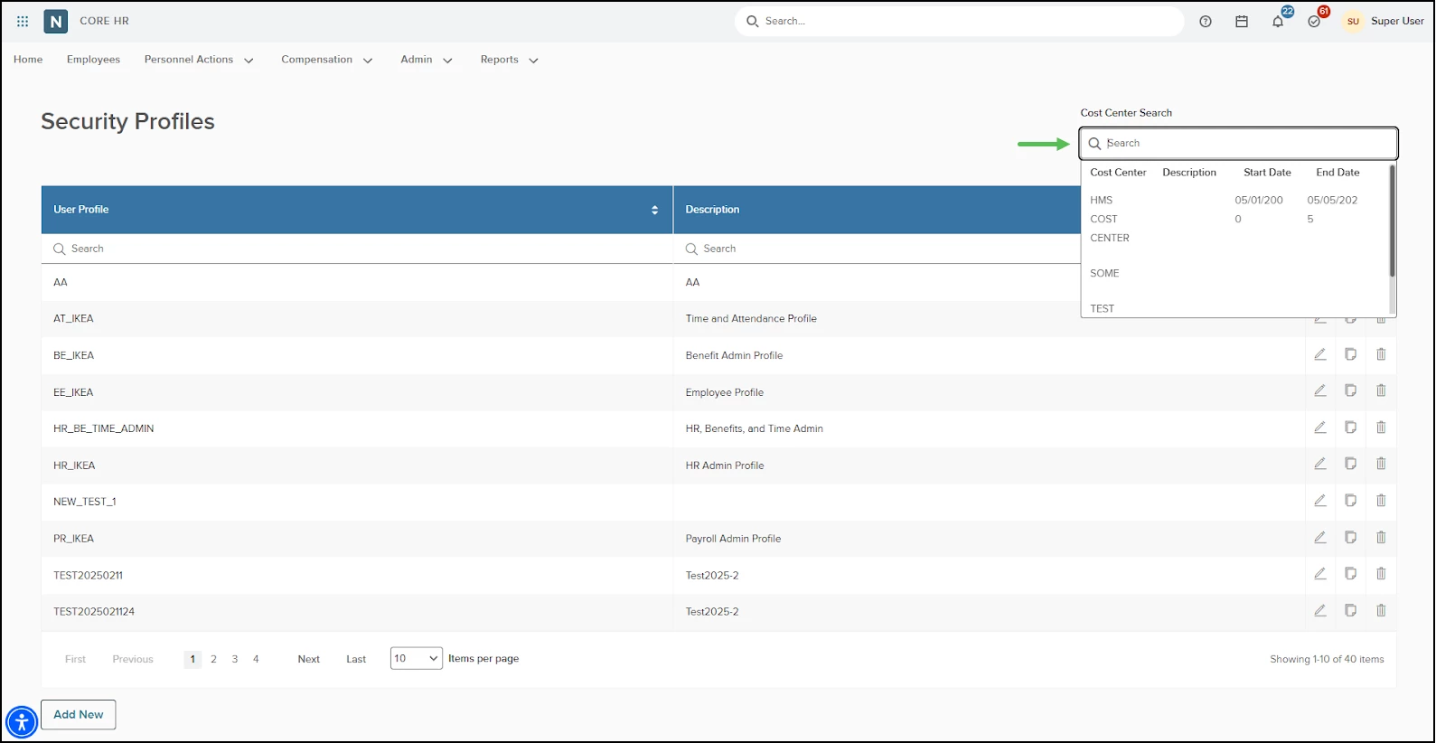 With this release, we've added the new Cost Center Search field on the Security Profiles page. This field makes it easy to find any profiles linked to a specific cost center through the Data Access tab. Whether the tab is set to Restrict To or Restrict From, the search will pick it up. In the dropdown, you’ll see helpful details like the cost center name, description, and start and end dates.
