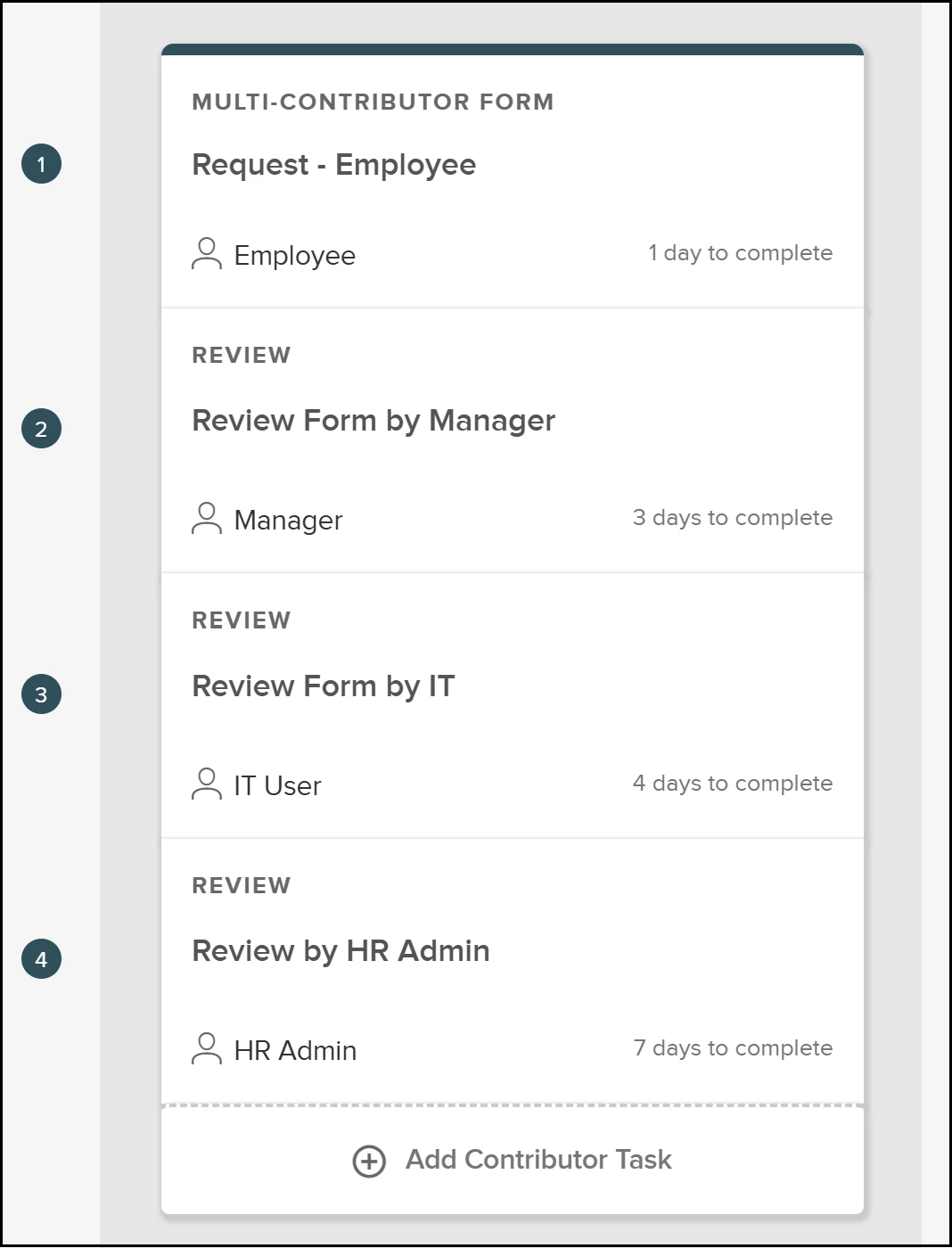 - You can configure Manager Review, HR Review, and IT Review as three consecutive review form tasks in the same set of multi-contributor form tasks, instead of mixing workarounds with contributor tasks.