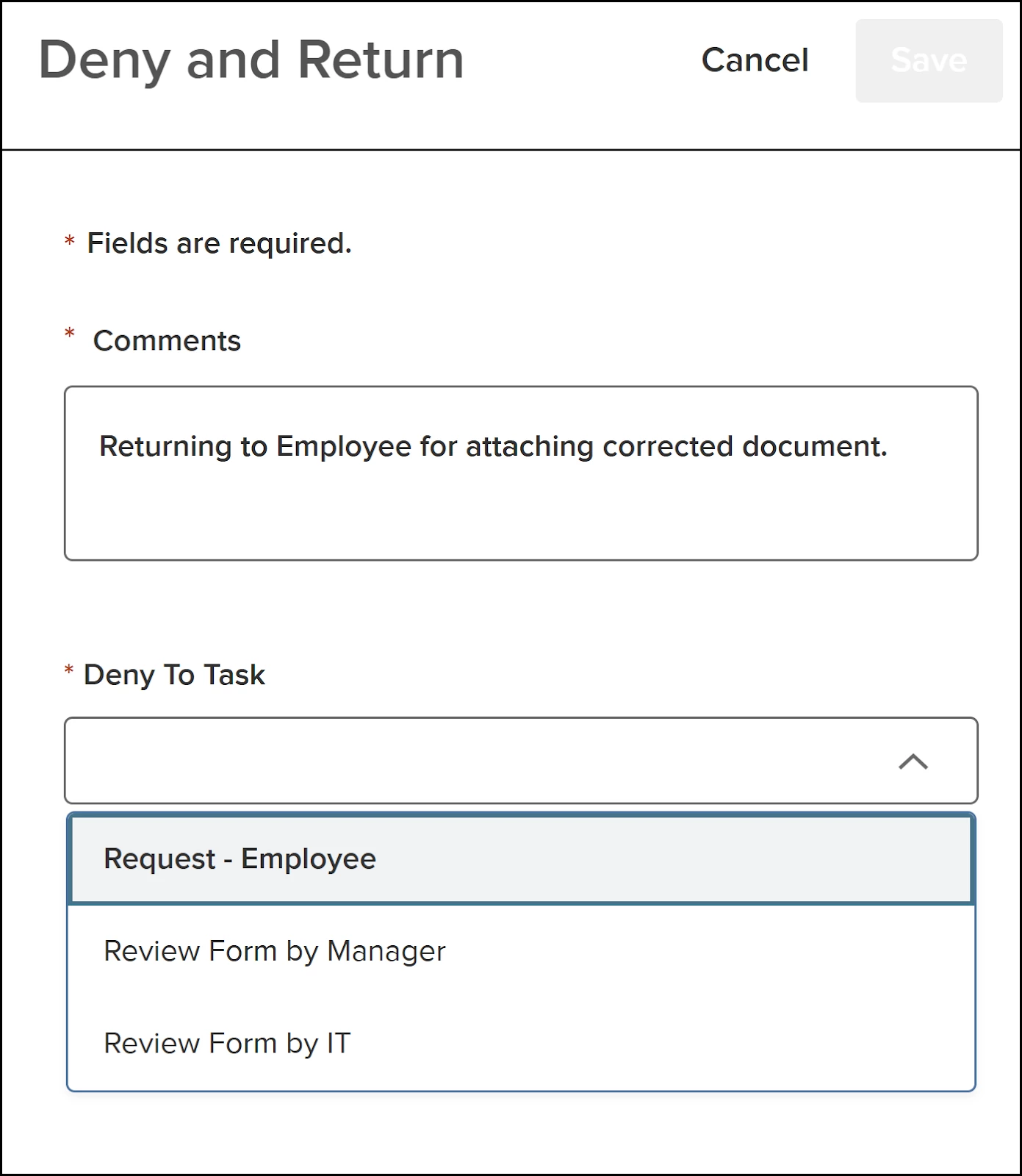 - HR opens the form and notices the manager didn’t include enough justification. From the review task, HR clicks Deny and Return.