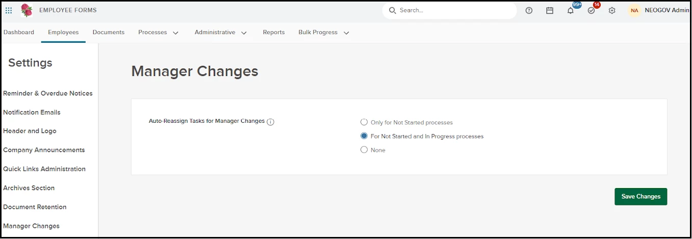 Admins with access to the Settings page in eForms will see a new Manager Changes menu item at the bottom of the list. Opening the menu shows the Auto‑Reassign Tasks for Manager Changes options.