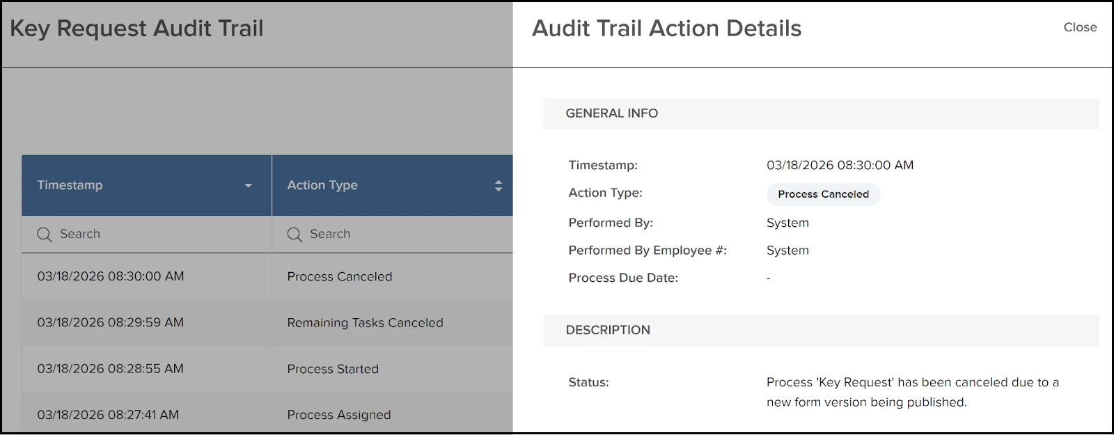 Each process cancellation triggered by a new form version creates an audit entry with this statement: “Process has been canceled due to a new form version being published.”