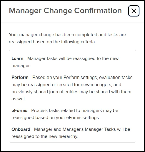 Manager changes in eForms will be more controlled and consistent across systems. New safeguards and automation reduce manual updates, keep reporting structures in sync, and make manager changes easier to track for HR.