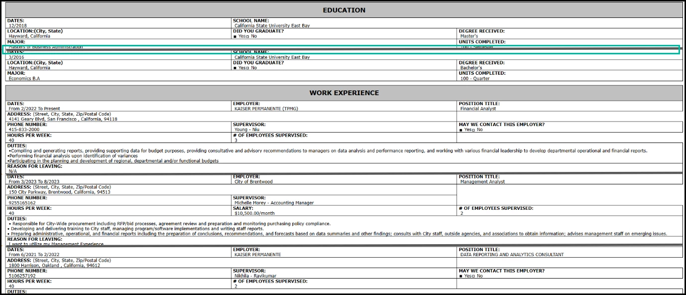 When printing applications in Insight, an application section with multiple records (such as multiple jobs in the Work Experience section or multiple schools in the Education section) visually runs together, making it difficult to see where a new record begins. Thicker borders have now been added between such records to create a more obvious distinction.