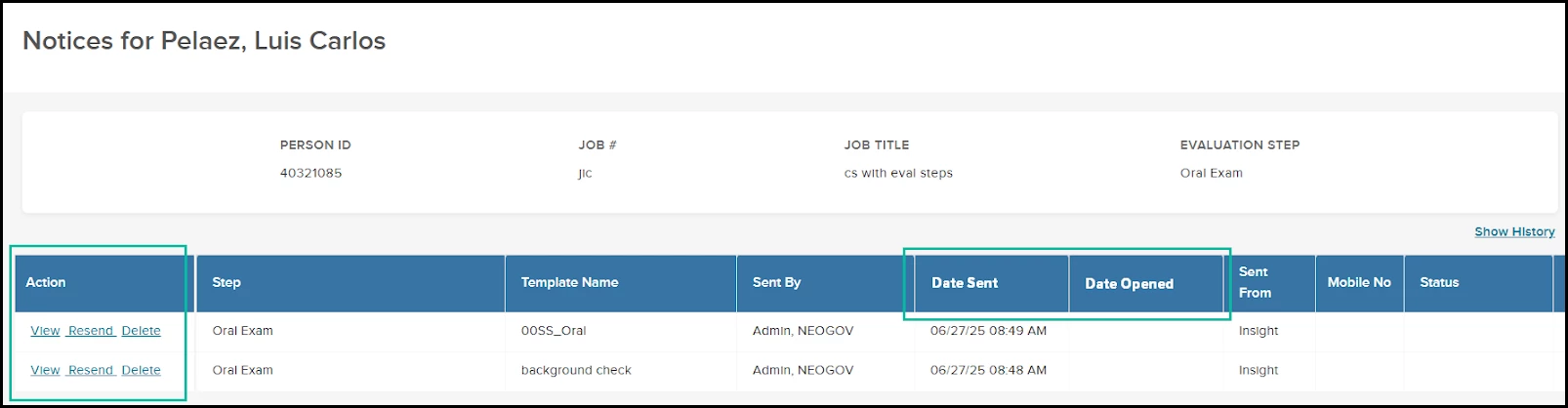 Notices previously sent to an applicant are displayed in a grid, with each notice in a separate row. The wide grid, with the View link in the Action column at the far right, required a lot of horizontal scrolling each time to view the notice. The Action column has now been moved to the left side of the grid, making it easily accessible upon page access.