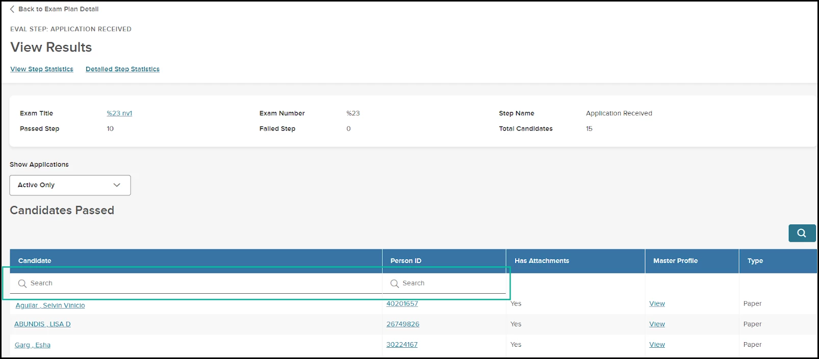 On the View Results page for an evaluation step, Insight organizes candidates into grids such as Candidates Passed and Candidates Failed. If you are looking for a specific candidate, there was previously no easy way to find them in these grids. For steps with a high volume of candidates, this resulted in tediously scanning through page after page in the grid. We’ve added a search function to the Candidate and Person ID columns in the grid.