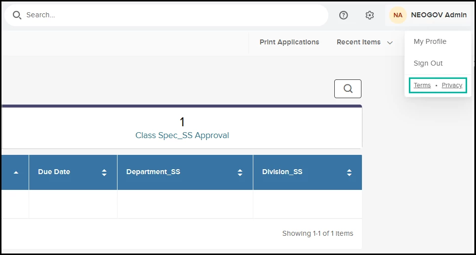 The NEOGOV Terms and Privacy links are previously displayed in the footer at the bottom of all pages. They have now been moved under the user profile menu, and the footer has been entirely removed.