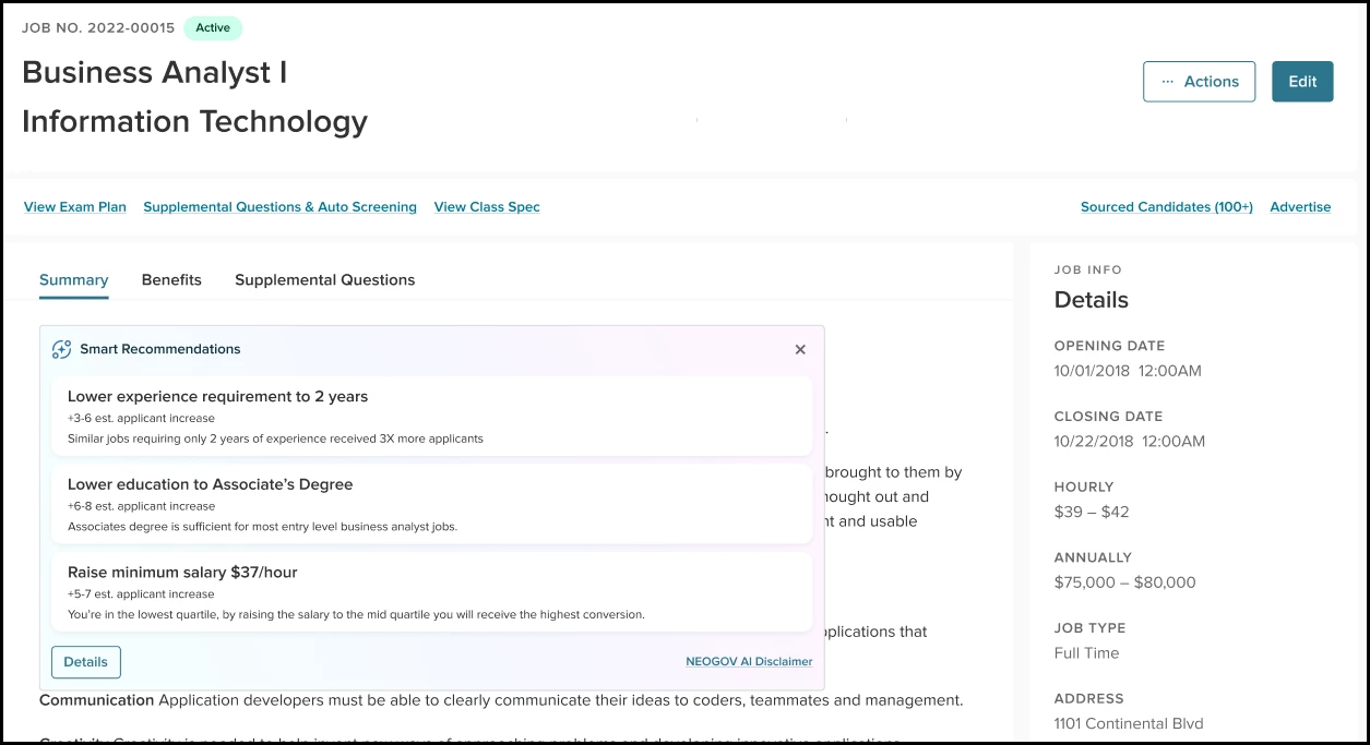 For job postings that are trending low for applicant volume, this AI-based feature will analyze similar jobs at similar organizations and suggest recommendations to adjust the qualifications and salary to improve your results. For example, you have a Project Manager opening trending low, which requires a minimum education of a Bachelor’s degree. Benchmarking for Project Manager openings at similar agencies reveals that most require only an Associate’s degree and are attracting better applicant traffic. This feature will recommend reducing the education requirement for your opening and forecast the expected increase in applications.