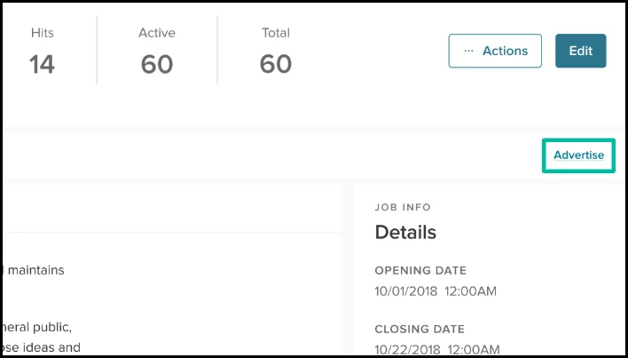 If a job posting is active and the user has job advertisement permission, an Advertise link now displays on the Job Details page in view mode (such as not in add/edit mode). Clicking the Advertise link opens a flyout with the JobTarget Marketplace, where you can explore and purchase ads for the job on external boards