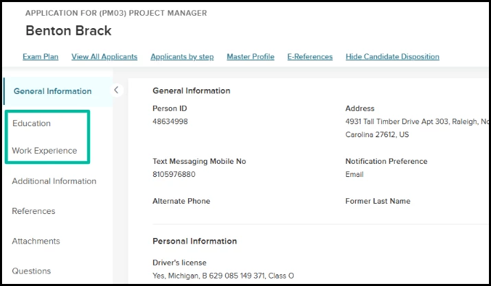 Jobs > Exam Plan > View Applicants by Step or View Applicants > Select Applicant