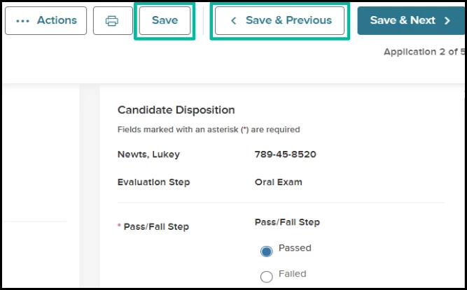 Previously, after entering a disposition change on an application, the Next button dynamically transformed to Save & Next, and the only way to save the change was to click that button, thus forcing the user to advance to the next application. Three save options are now available for disposition changes: