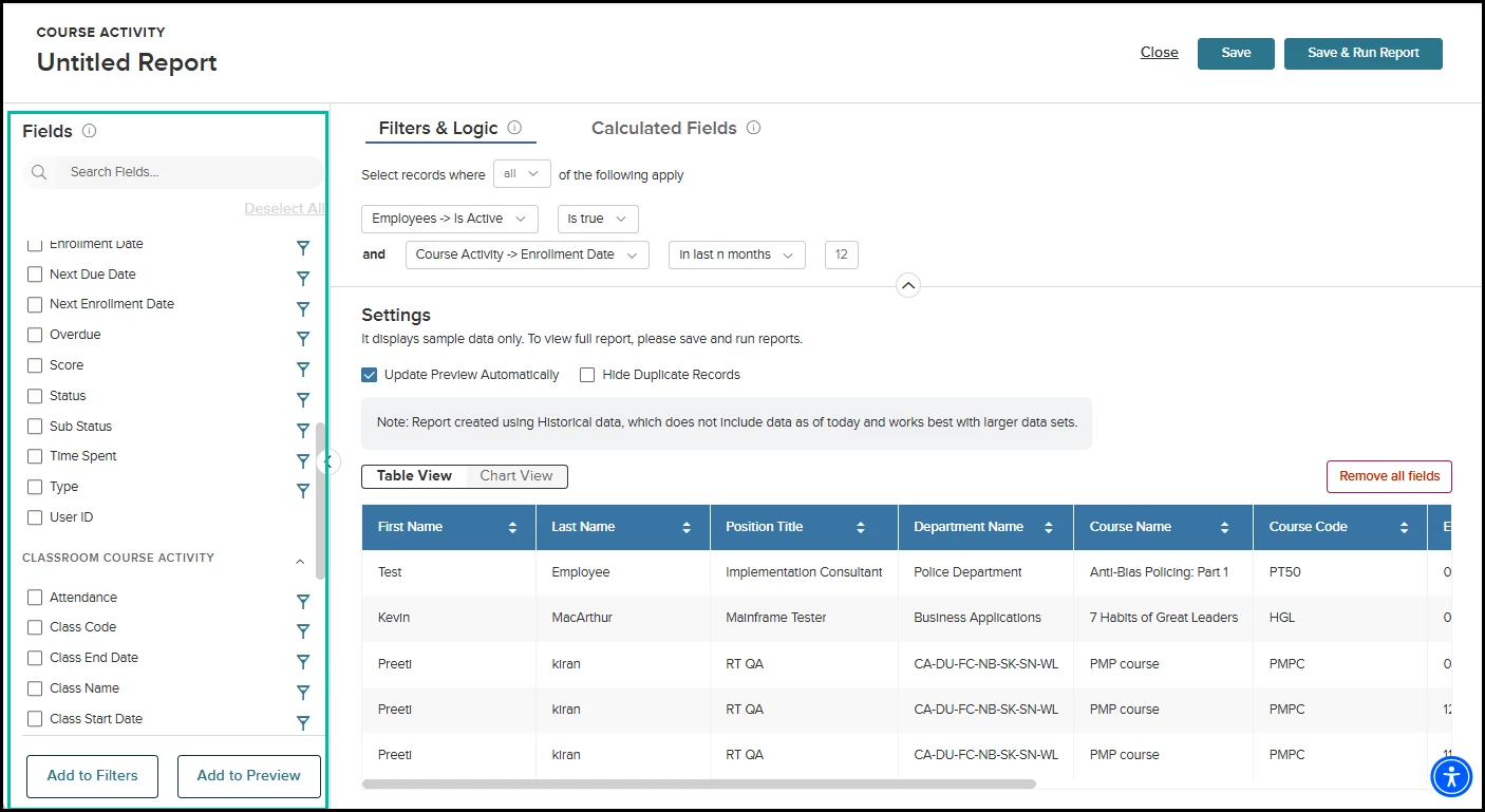 The Course Activity and Learning Plan Activity reports display training data based on employee records meeting the reporting criteria. By default, the Preview section, which filters for Active employees in Active departments, displays the first five matching records. All other applicable records will display upon clicking Save & Run Report.