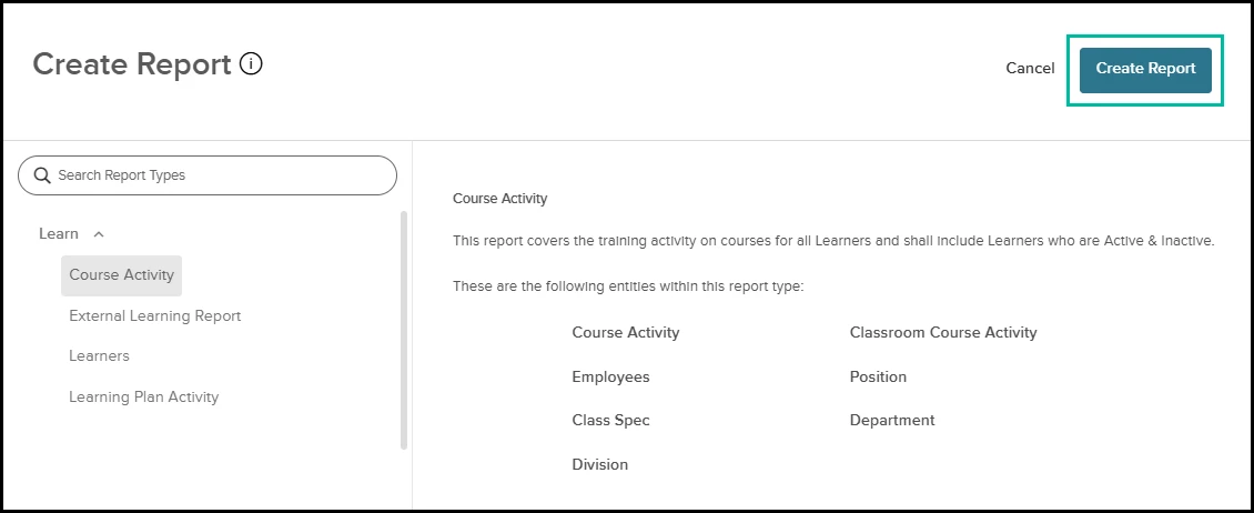 - Search for the Learn Report Types: Course Activity or Learning Plan Activity