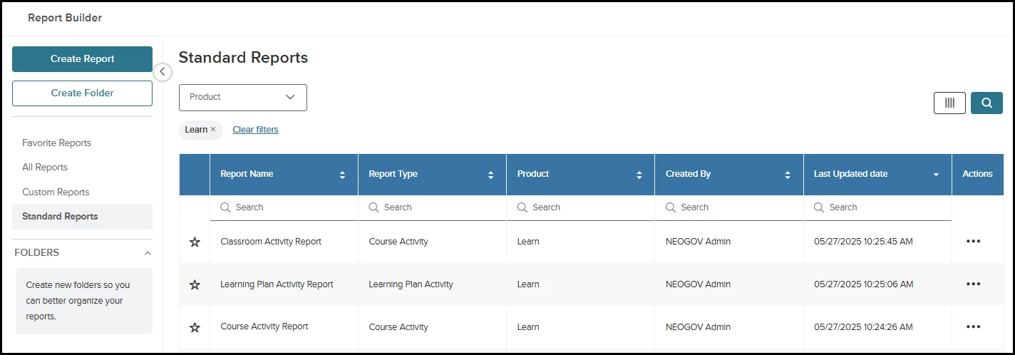 From here, you can quickly access any reports you've created or open a Standard Report provided by NEOGOV/NEOED. Available standard reports include Course Activity, Classroom Activity, and Learning Plan Activity.