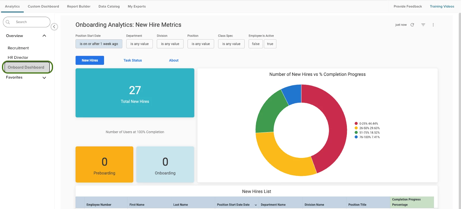 - The Onboard New Hires dashboard buckets new hires by completion progress. That way, HR can easily identify stragglers. It also gives a count of new hires within a specific time period and how many of those new hires are 100% complete with their preboarding and onboarding.