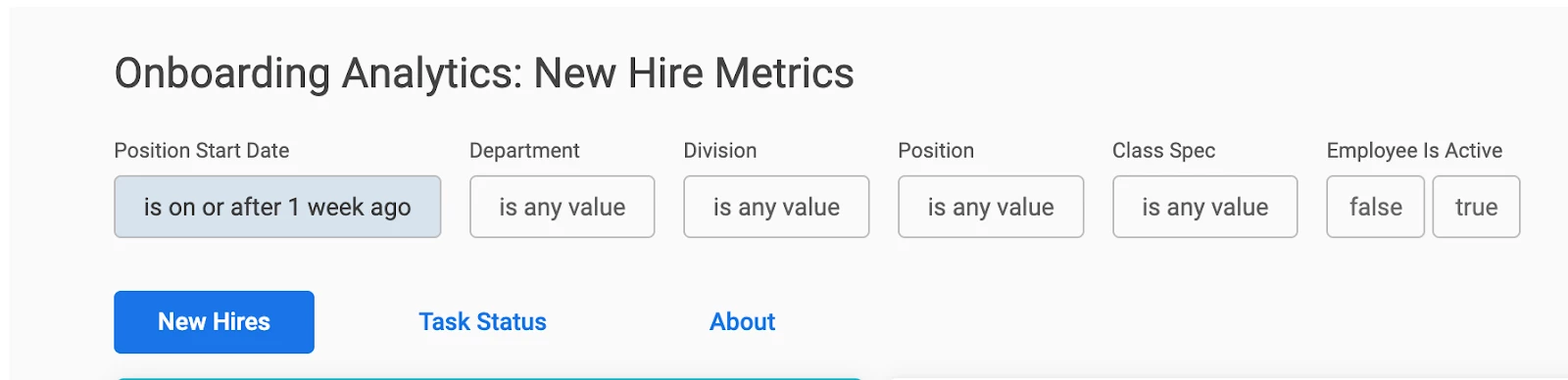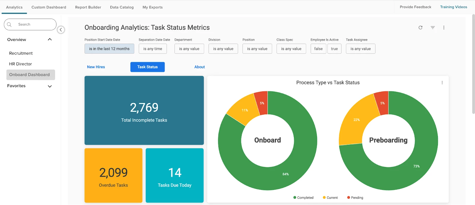 One of these new dashboards is the Onboard Analytics Dashboard, which itself is made of the New Hires and Tasks Dashboards.