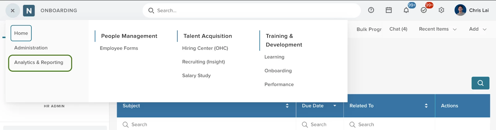 - Log into Onboard as an HR Admin or HR User and then select the product switcher in the top navigation. Select Analytics & Reporting.