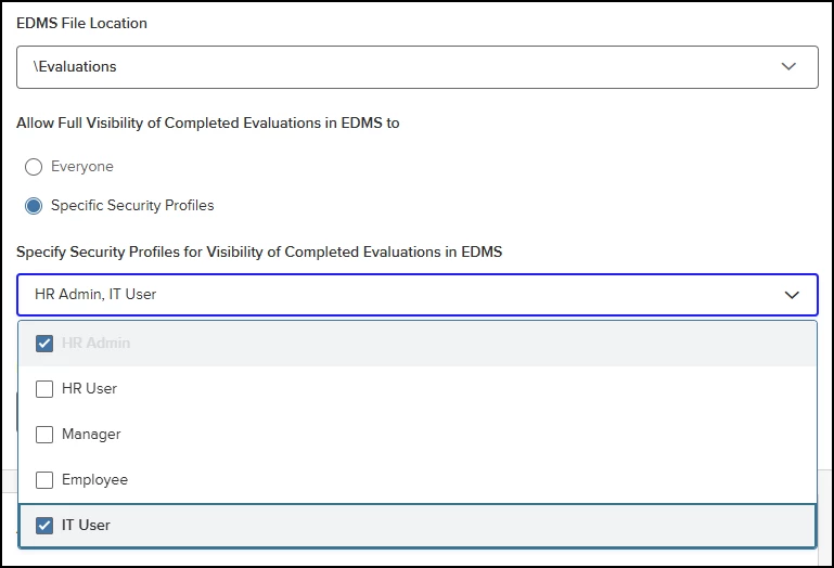 Previously, HR admins had implicit access to evaluations sent to EDMS, but the user interface did not make this clear. With this update, HR admins are now automatically shown as selected when using Specific Security Profiles, and the IT User role is available for configuration. This ensures both roles are managed consistently and transparently when defining who can view evaluations sent to EDMS.