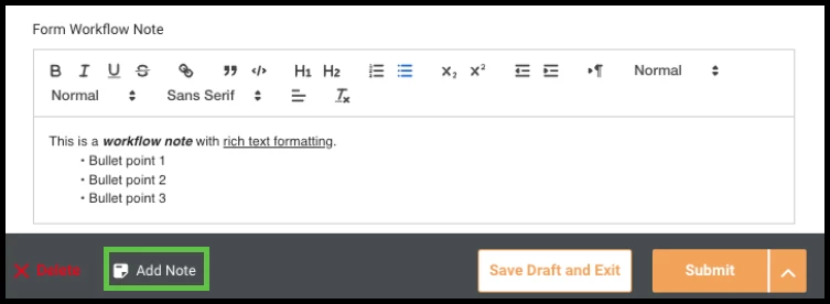 The new workflow note field is found on forms’ Summary tab. You can click on the Add Note button in the footer to go directly to the Workflow Note field.