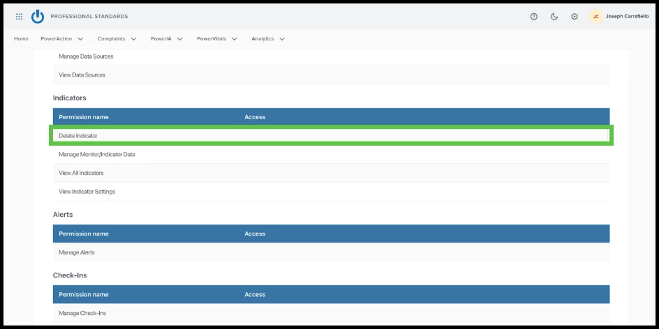 Note: To delete singular indicators from data sources, users need the assigned permission Delete Indicator, which is located in the Indicators section of PowerVitals permissions. If users don’t have this permission, they will not be able to complete the action and instead will see a message telling them Permission needed to delete.