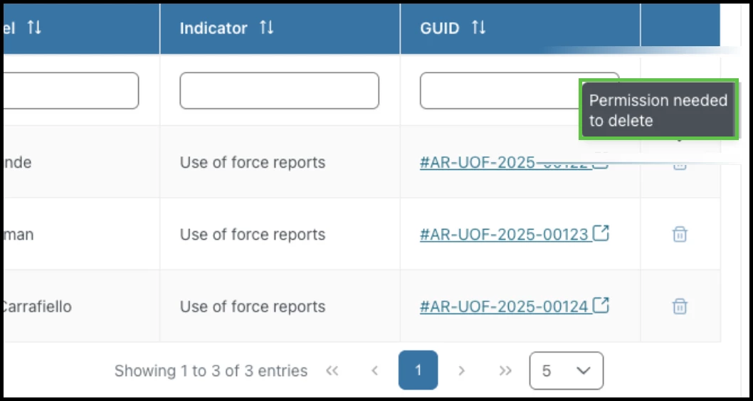 Data Sources: Trashcan icon available in the slide-out view with an additional column. (note: CAD events data source is missing the trashcan and this will be fixed shortly. Please use the profile or indicator table to delete CAD events from a user)