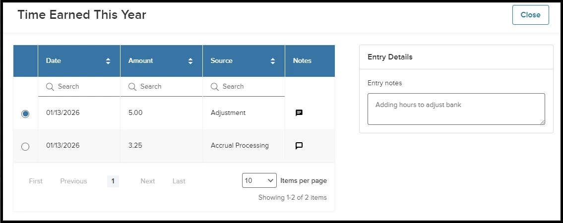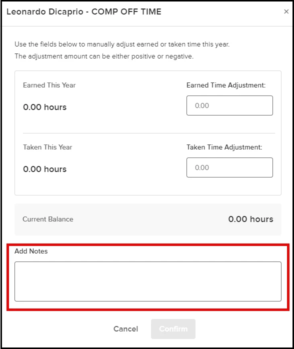 If any hours are entered before clicking Confirm, the notes will be attached to that adjustment. If hours are entered for both Taken AND Earned, the same comment will attach to both of these adjustments.