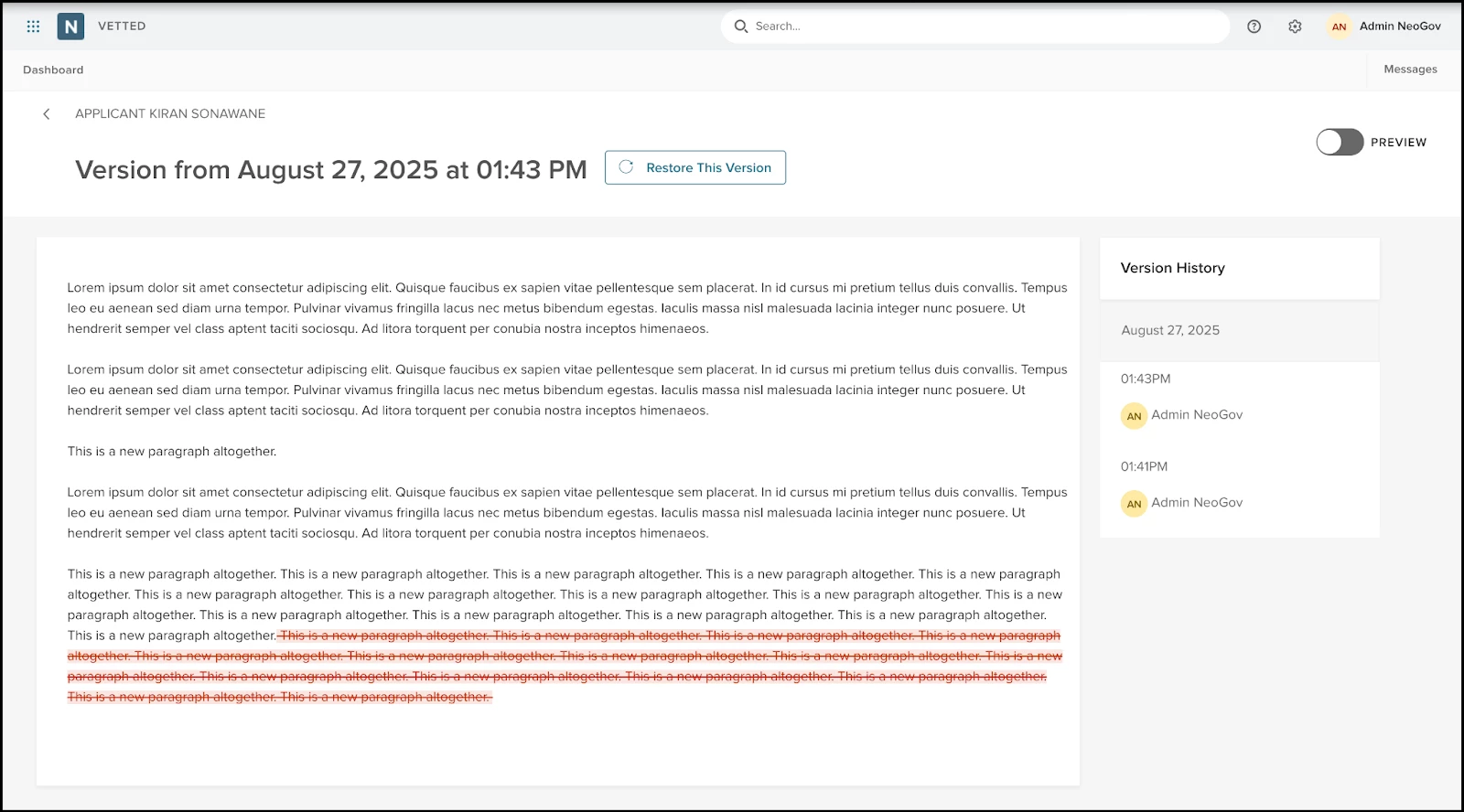 - A supervisor reviewing a case notices discrepancies in the applicant summary. Using version history, they quickly compare edits, see who made them, and restore the correct version.