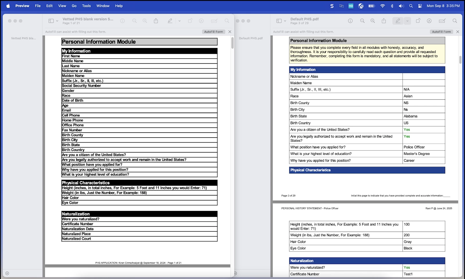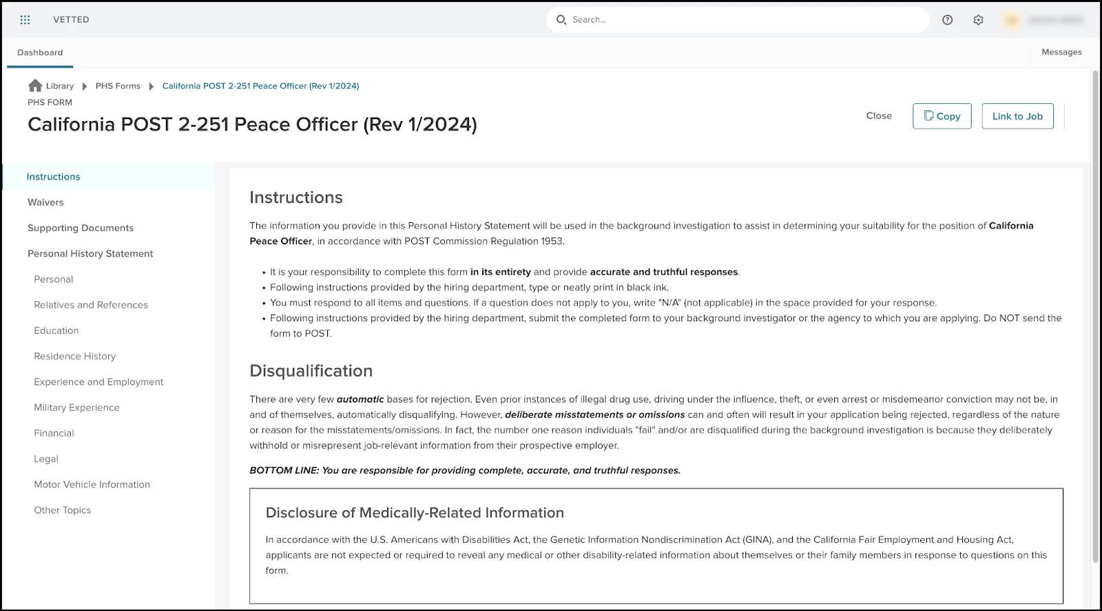 - Delivered as a standard PHS template. Vetted’s Personal History Statement (PHS) mirrors 2-251 exactly, with the same sections, order, and formatting as per CA POST requirements.